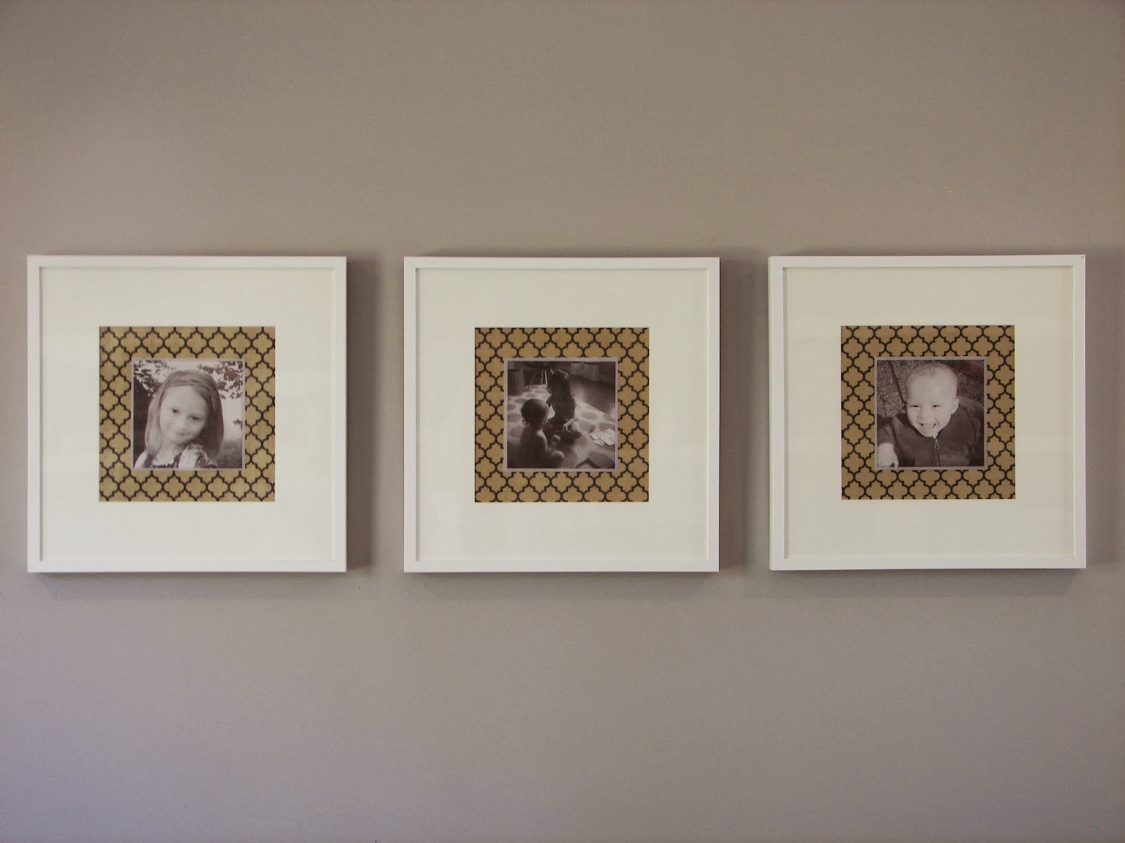 I decided we needed our own Instagram gallery so off to Ikea I went to pick up the same Ribba frames that they used. Seeing the frames in real life was completely different than seeing them on a computer screen. They are huge at 20x20 inches! So, I decided that three frames would do the trick. I printed the pictures myself because I was too impatient to wait for prints to be made. I chose one of each of the kids and one of the both of them playing together. It is actually a super sweet picture of Audrey teaching Will how to do something. It is one of my favorites for sure! The prints turned out a lot better than I expected for an at-home job. The space inside the mat is 11x11 so I printed 8x8 pictures. I mounted the pictures on top of some fun, patterned gift wrap from Target's dollar section that I picked up awhile ago. Once framed, it was time to get them up on the wall.